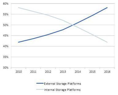 В абсолютном исчислении накопительные емкости обоих типов, разумеется, продолжают прирастать новыми объемами. Для внешних систем хранения enterprise-масштаба в 2010-2016 годах средняя скорость роста должна составить 52% в год (подчеркнем, что речь идет не о долларах, а о терабайтах... петабайтах, зетабайтах). Внутренние платформы хранения промышленного уровня пройдут эту дистанцию с темпом в 36% в год.