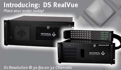 Компания Integral Technologies объявила о выпуске DS RealVue, новых моделей в семействе продуктов DigitalSENTRY. Продукты DS RealVue -- первые в отрасли средств видеонаблюдения цифровые видеорегистраторы, работающие в реальном масштабе времени. Они способны одновременно записывать видеосигналы с 32 камер при скорости 30 кадров в секунду и максимальном разрешении D1 (720х480). Выпускаются в двух модификациях: DS RealVue RAID и DS RealVue XPress.