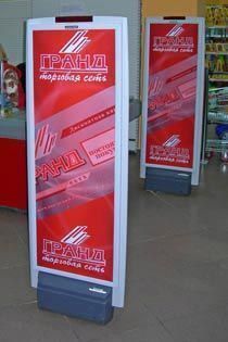 Для размещения рекламы к стойкам прилагаются специальные панели для рекламных постеров. Они представляют собой две рамки, которые накладываются с двух сторон на антенны противокражной системы, скрепляясь между собой специальными стяжками. Рекламный постер, максимальные размеры которого составляют 127,6 х 43 см, вставляется в эти рамки и прижимается их кромками. При этом замена постеров не требует специальных навыков и может производиться в любое время.