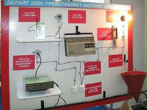 В роли подсистем интеллектуального здания успешно выступили обычные бытовые приборы. Стандартная лампа накаливания символизировала систему освещения, систему вентиляции и кондиционирования представлял электрообогреватель "Ветерок-5", а с задачей озвучивания справлялся транзисторный радиоприемник. Механизированный дверной глазок был основой системы видеонаблюдения. Система пожаротушения не была задействована, но багор и пожарное ведро всегда были наготове. Все подсистемы были связаны кабельной сетью "на изоляторах" и управлялись "клавишным" центром управления. Такое нестандартное оформление схемы работы "Умного дома" обеспечило дополнительное внимание к стенду "ДеЛайт 2000" и показало творческий подход специалистов компании при визуализации предлагаемых решений.